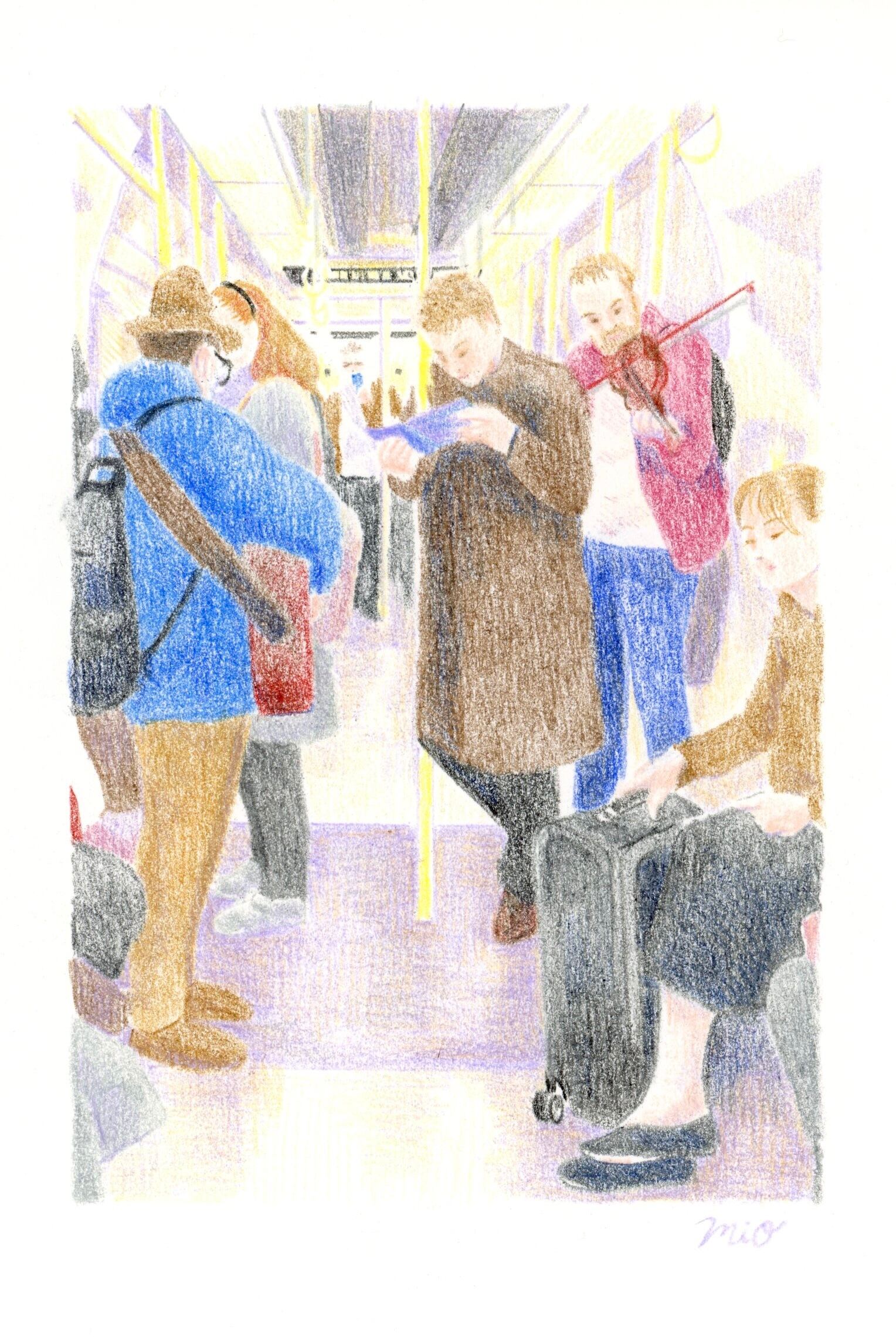 おじさん二人がヴァイオリンとギター弾く地下鉄車内。
